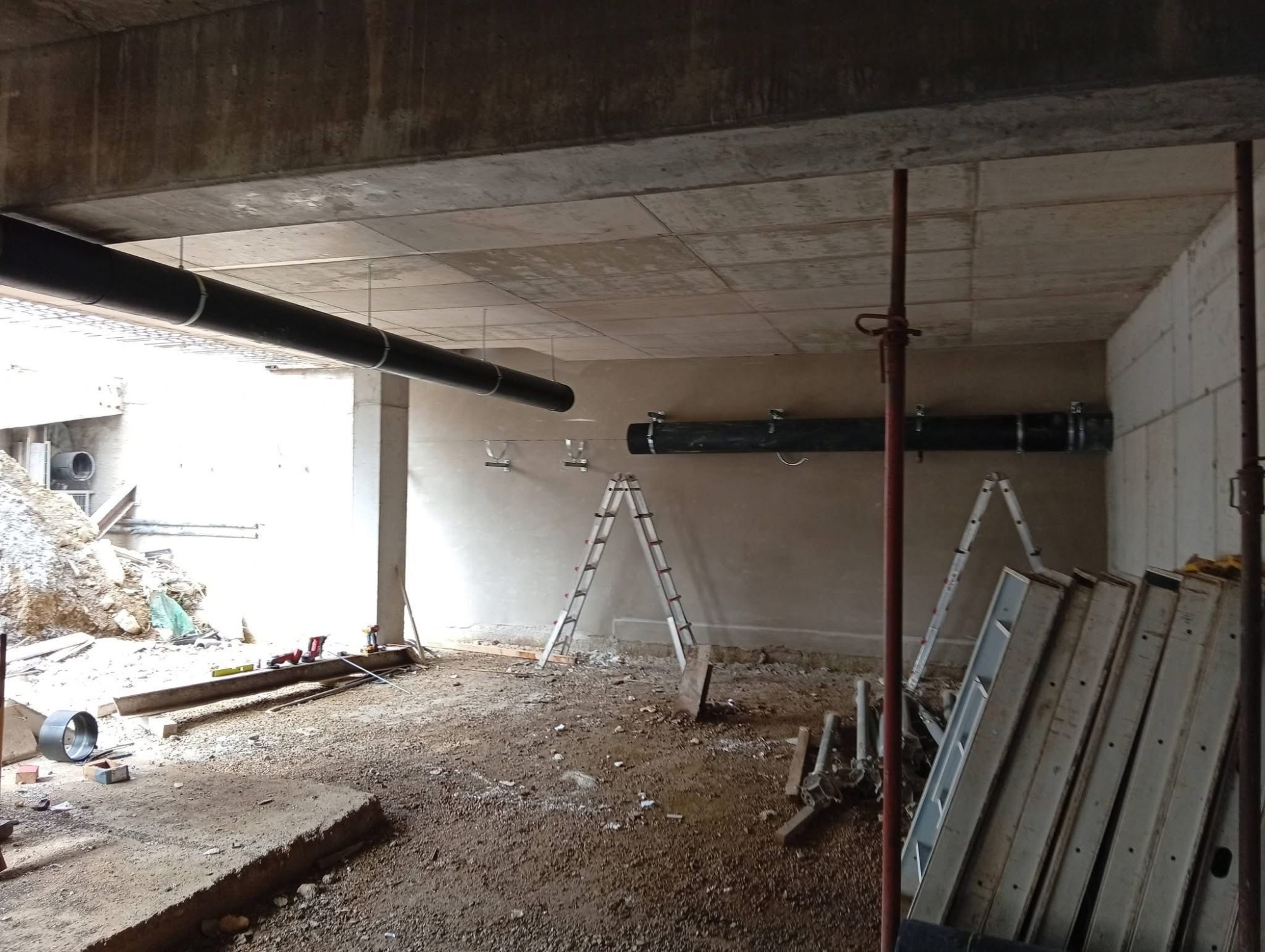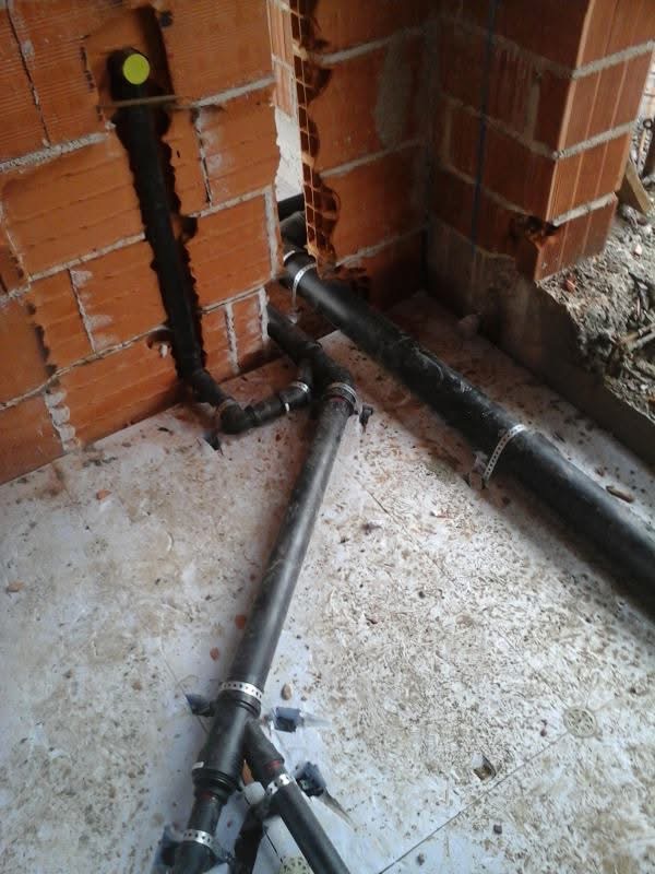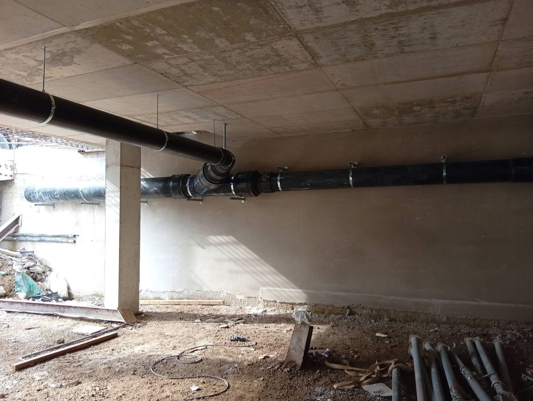 Colonne di scarico sospese in polietilene termosaldato realizzate nel seminterrato, sottostante ai cupolex (igloo) per creare lo stesso, ventilato presso edificio a Mirano (VE)