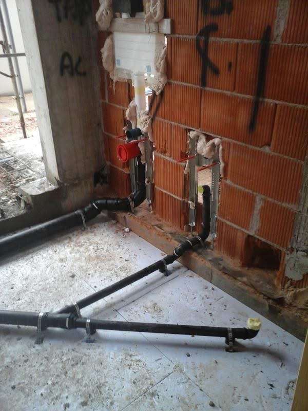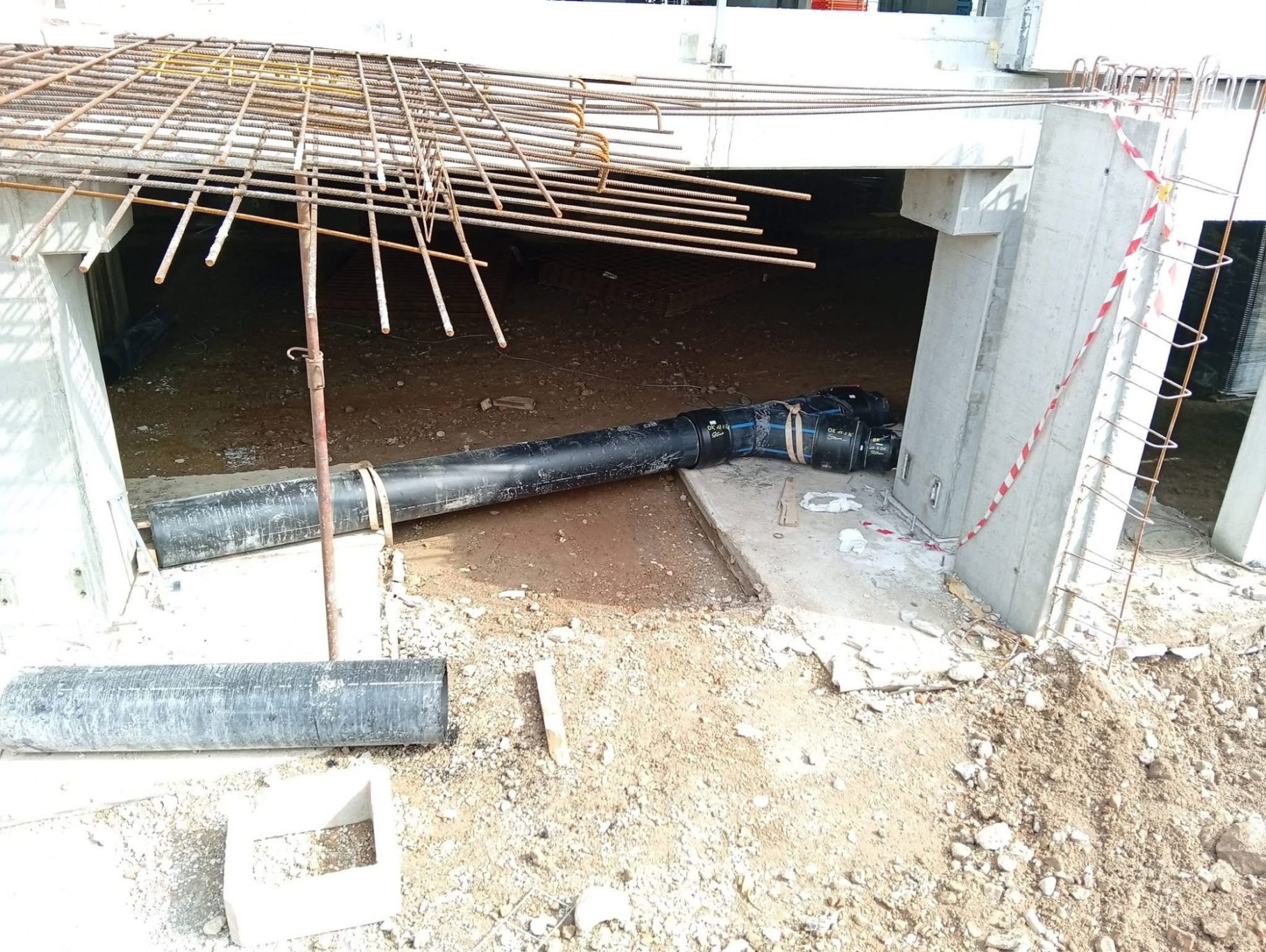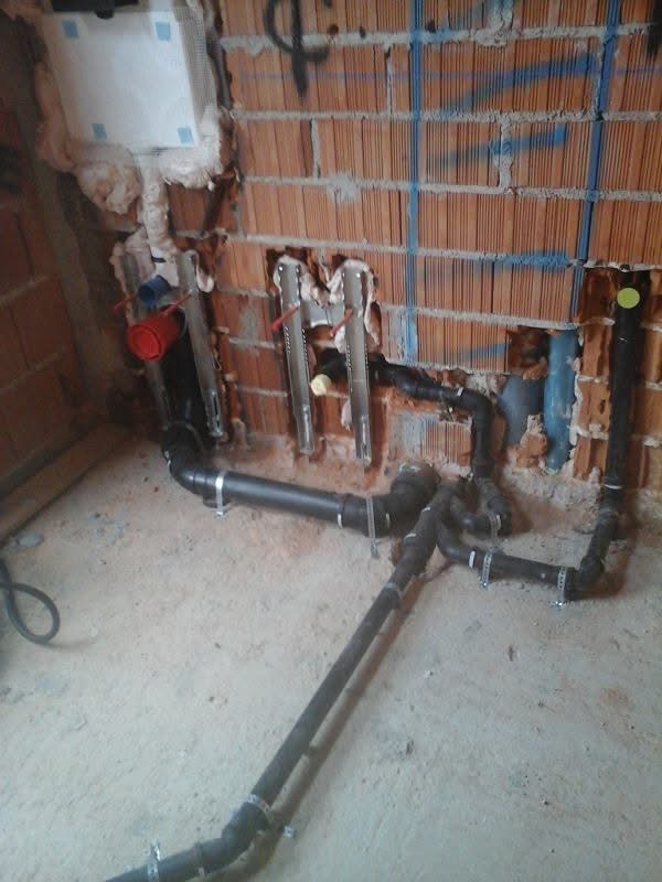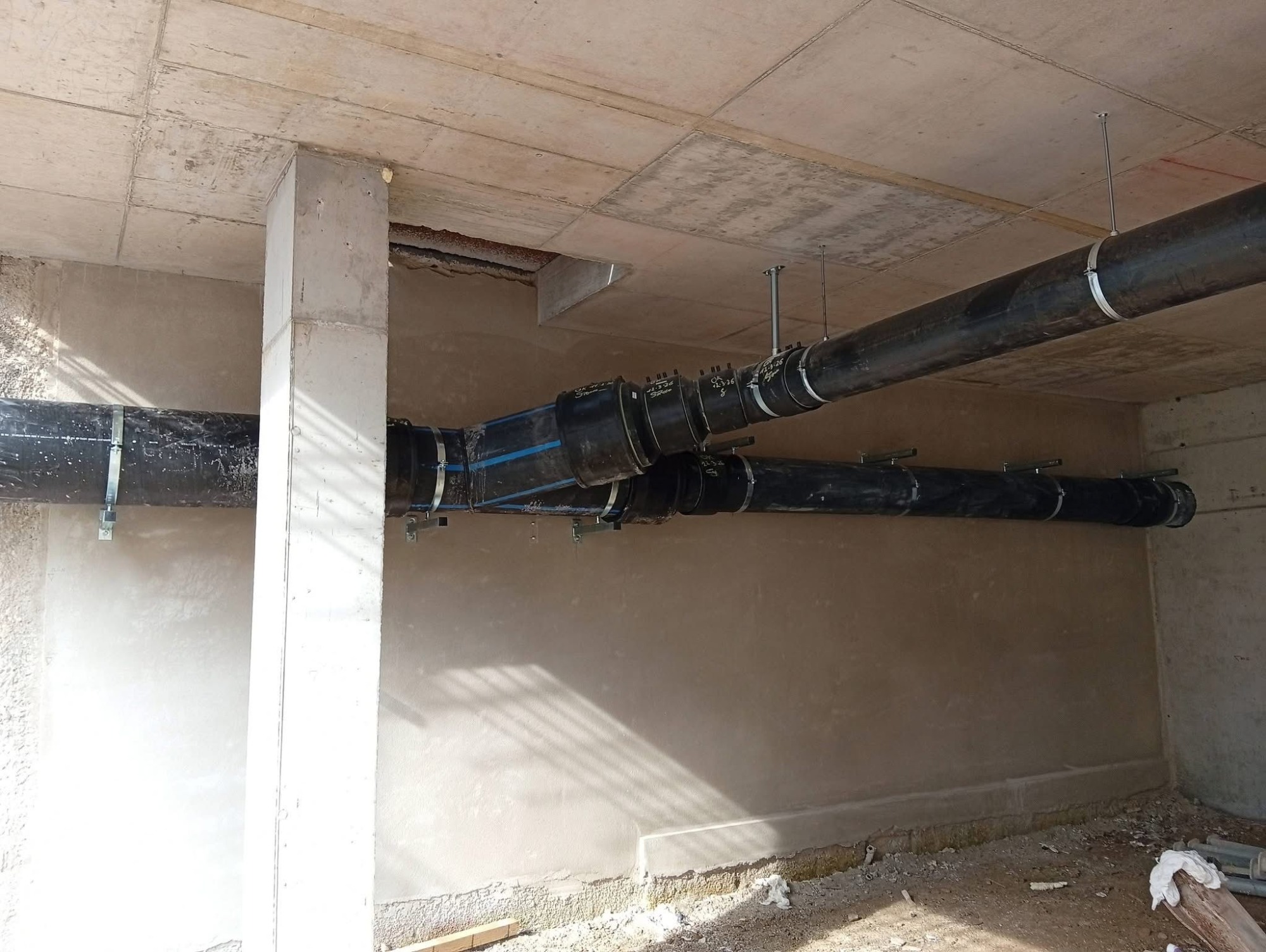 Colonne di scarico sospese in polietilene termosaldato realizzate nel seminterrato, sottostante ai cupolex (igloo) per creare lo stesso, ventilato presso edificio a Mirano (VE)